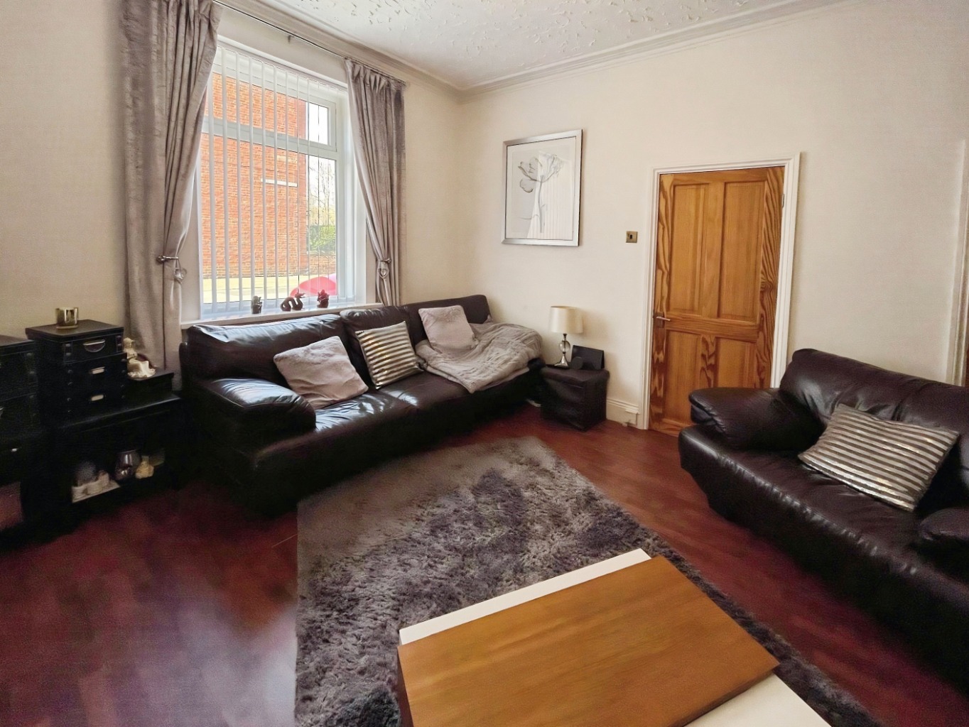Upon entering the property, you are welcomed by a handy entrance area, perfect for coats and shoes, creating a practical and tidy first impression. To the right, the spacious living room provides a comfortable and inviting space, finished in neutral décor with dark wood laminate flooring. A built-in storage cupboard adds further convenience, helping to keep the space clutter-free.