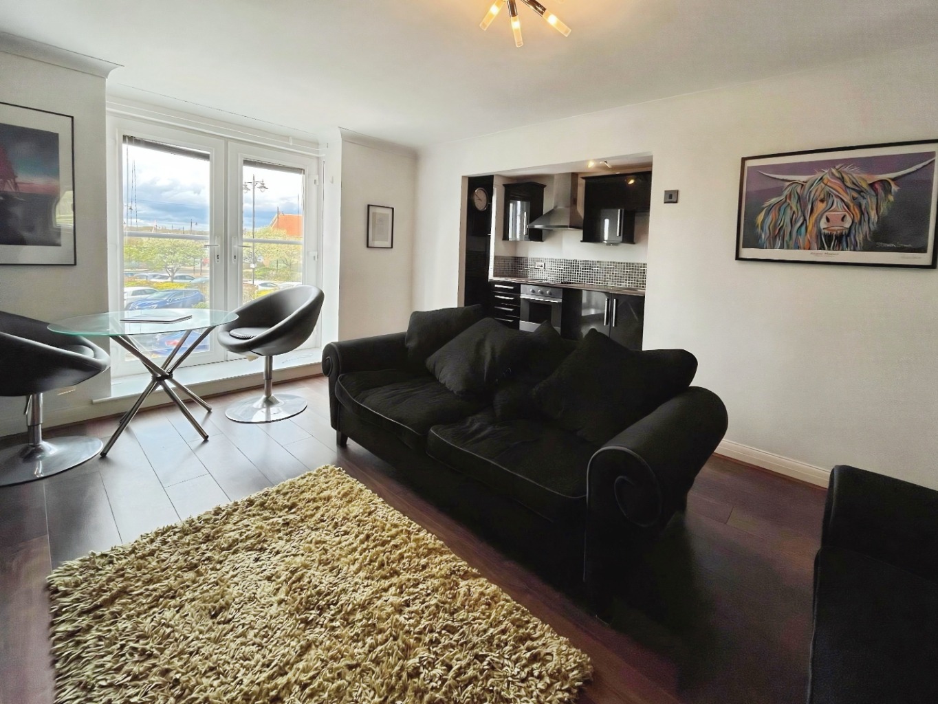 The heart of the home is the spacious open-plan living room and kitchen, perfectly suited for modern living. The living area is bright and airy, featuring wooden flooring and neutral tones, with the added benefit of a Juliet balcony that allows you to fully appreciate the impressive riverside views.